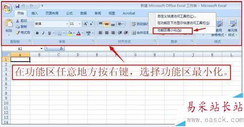 1、在功能區任意地方按右鍵,選擇“功能區最小化”。