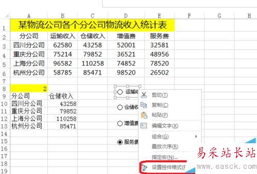 3、右擊——設置控件格式——單元格鏈接(A$8$),從上面可以看出A$8$所在單元格的值為1,鏈接的是運輸收入62580那一列,為2時,鏈接倉儲收入43258那一列。