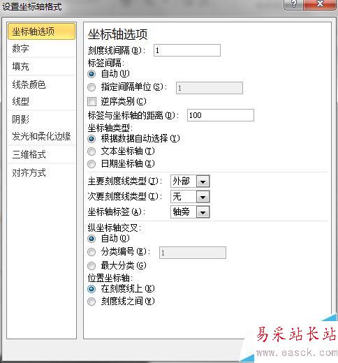 4、對X軸進行設置格式,在【坐標軸選項】中設置“位置坐標軸”在“刻度線上”。