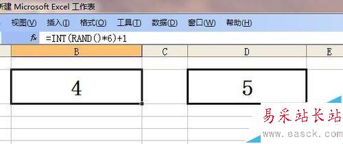 11、這樣我們就完成了設(shè)置,我們看到這兩個單元格就是兩個骰子。我來示范一下怎么玩。第一個人按下F9,然后松開,會發(fā)現(xiàn)這兩個單元格的數(shù)字分別是4和5,那么點數(shù)就是9.