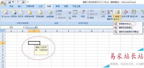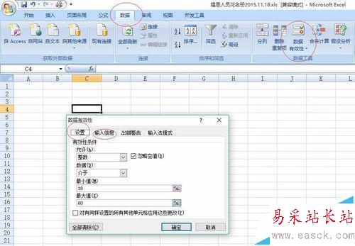 為了保持數據的有效性或一致性,需要對輸入值限制,并告訴應該填什么。比如只能輸入18至60的年齡的數值,就可以點擊“數據”——“數據有效性”——“數據有效性”,輸入“輸入值限定”和“輸入提示”