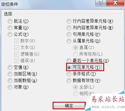 4、在定位條件對話框中選擇:可見單元格,單擊確定。