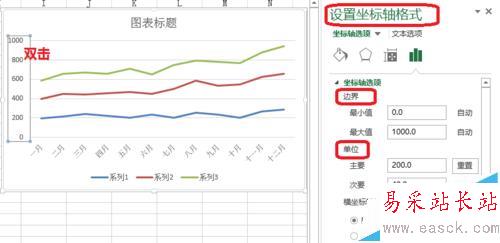 2、雙擊坐標軸——設(shè)置坐標軸格式——坐標軸選項——邊界,單位。根據(jù)實際情況進行設(shè)置。