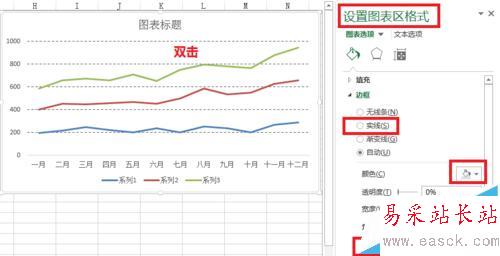 3、如圖所示,雙擊網(wǎng)格線——設(shè)置圖表區(qū)格式——實線——顏色——短劃線類型。根據(jù)需要進行相關(guān)設(shè)置。