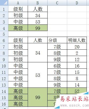 1、現有如下數據,想用餅圖來體現各級別的人數情況,同時也想把高級中7-8-9三個級別的明細人員也體現出來,該怎樣制作餅圖呢?