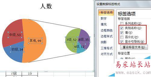 6、在圖表上右鍵選擇“添加數據標簽”,在數據標簽上右鍵選擇:設置數據系統格式,在彈出的對話框中勾選“標簽選項”中“類別名稱”,關閉對話框,此時的效果如下圖。