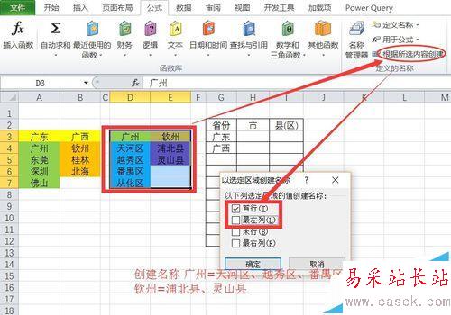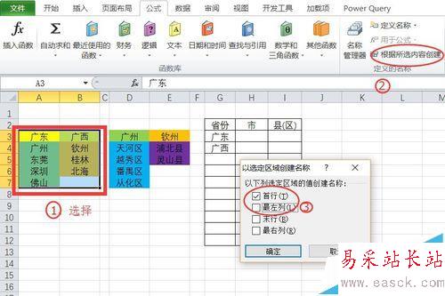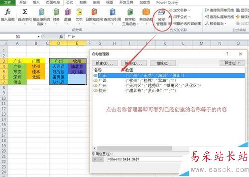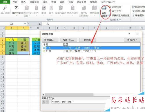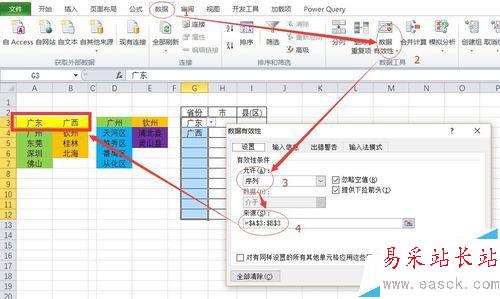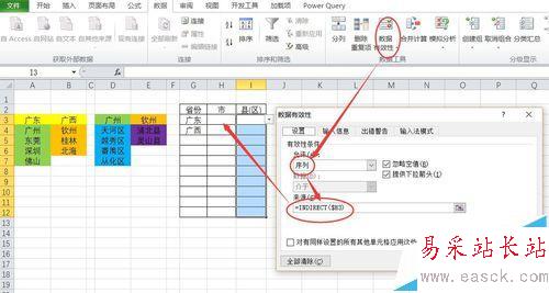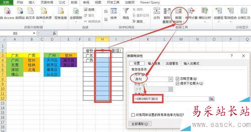 第一級菜單為省,也即是廣東、廣西,因此直接利用數據有效性的引用即可。