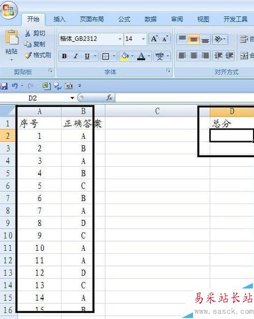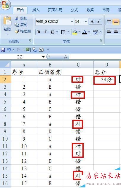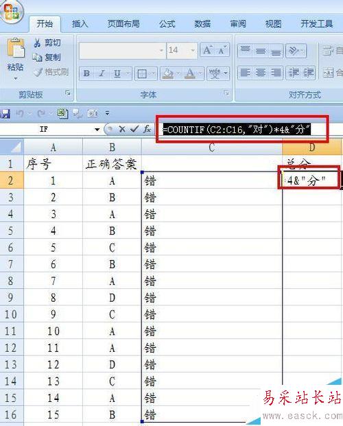 3、選擇D2單元格,輸入=COUNTIF(C2:C16,"對")*4&"分",統計出1到15題中正確答案的個數,并乘以每小題得分就可以算出總分了。現在顯示是0分。