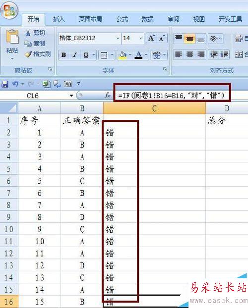 2、選擇C2單元格,輸入=IF(閱卷1!B2=B2,"對","錯"),用填充手柄把C列中的其他單元格也填充好,回車你可以看到顯示的都是錯誤。