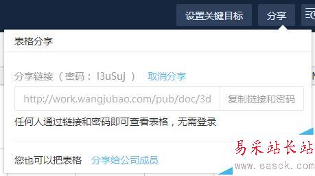 3、在右上方單擊分享,將會出現如下場景,此時,你就可以將此表格的url以及打開密碼共享給他人(他人無需登錄)。