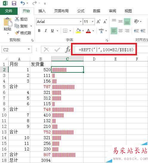 1、輸入公式=REPT("|",100*B2/$B$18)