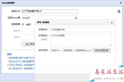 2、設置EXCEL數據集的來源文件和取數范圍。