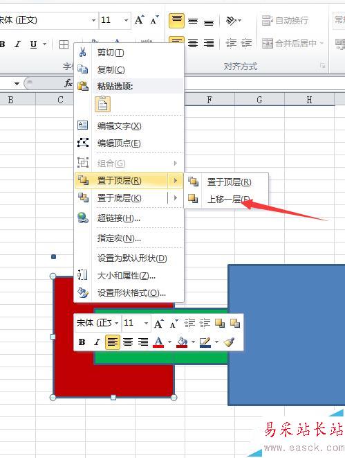 2、上移紅色一層,如何操作?右鍵單擊-置于頂層-上移一層