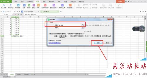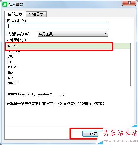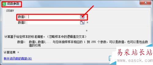 3、之后就會出現一個對話框,對話框是各種函數,選擇標準偏差(STDEV)這個函數,然后點擊【確定】,之后就又會彈出一個對話框,顯示的是【函數參數】,這個就是讓你選擇數據處理的范圍的,在數值1右邊有一個方塊的小標志,點擊這個小標志。