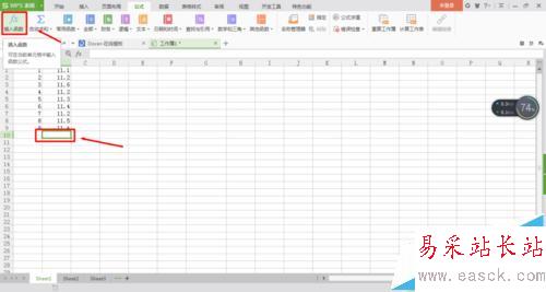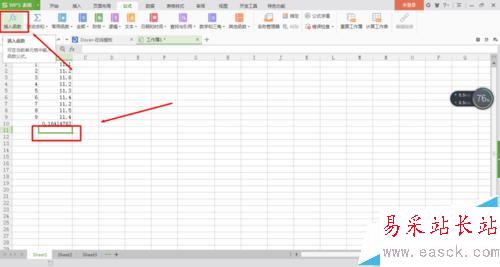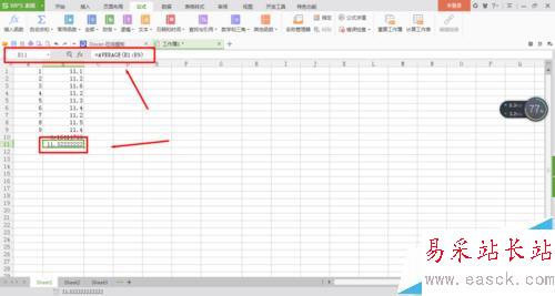 7、將光標選中B12,然后在編輯欄里打出“=”,之后用鼠標選中B10,在打出“/”然后再用鼠標選中B11,之后,編輯欄里面就出現了一個公式,就是“=B10/B11”,最后按【回車鍵】在B12所顯示出來的數字就是相對標準偏差了。