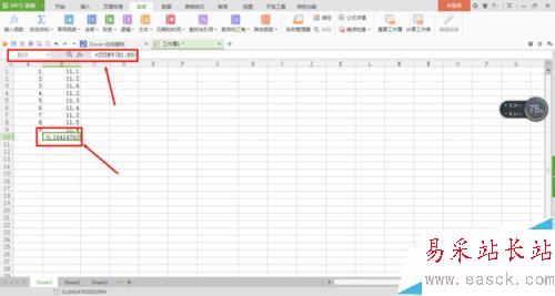 5、之后,在B10內就會算出標準偏差的數值,如圖顯示。之后就是要計算的是平均值,選中B11,之后還是點擊【插入函數】
