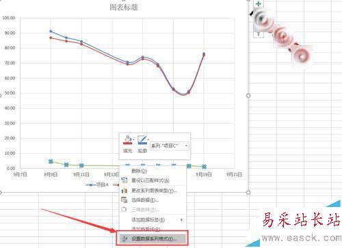 4、在散點圖中需要設置次要縱坐標的數據系列上點擊鼠標右鍵,然后選擇“設置數據系列格式”。
