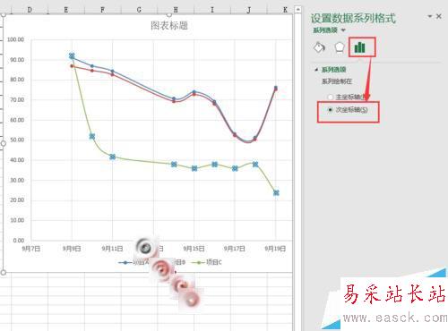 5、在打開的窗口中,選擇將系列繪制在“次坐標軸”。