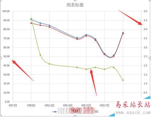 6、接下來就可以看到散點圖的右邊已經添加了一個新的坐標軸來適應剛才的數據系列。