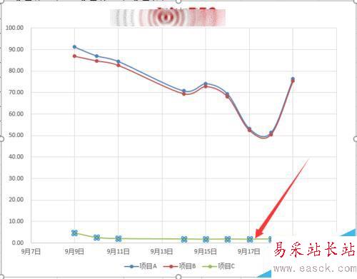 3、繪制出的圖標如下,其中項目C的數據由于非常小,因此在圖表的最底部,看不出任何變化。