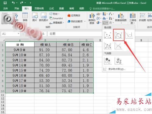 2、從散點圖類型的列表中選擇一種合適的散點圖樣式,然后軟件會自動繪制出散點圖。