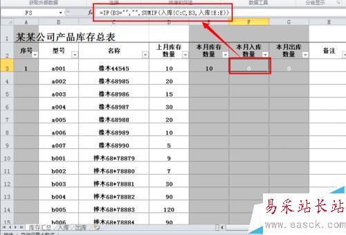 F3單元格中輸入此公式: =IF(B3="","",SUMIF(入庫!C:C,B3,入庫!E:E))