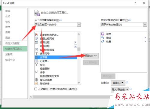 6、在快速訪問工具欄選項卡欄,將“從下列位置選擇命令”選取為“不再功能區的命令”,然后找到【計算器】工具將其選中,再點擊“添加”按鈕。如圖所示;