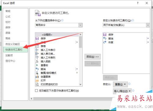5、在Excel選項對話窗口中,將選項卡切換到“快速訪問工具欄”選項卡欄。如圖所示;