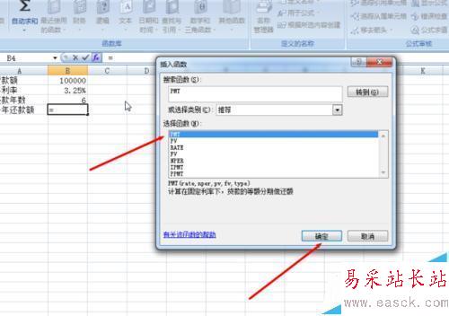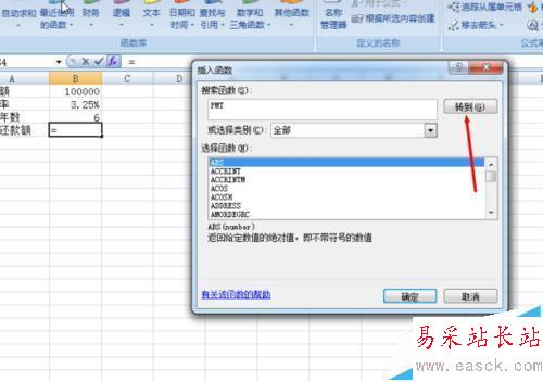 2、選定想要輸出數據的單元格,選擇“公式”選項卡,然后單擊“插入函數”菜單欄,在彈出的對話框的“搜索函數”中輸入PMT,單擊“轉到”,然后在“選擇函數”中就可以看到PMT,然后選擇PMT函數,單擊“確定”。