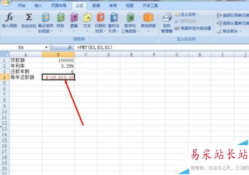 6、單擊“確定”后,結果就會出現在你點擊的單元格中,如圖所示。其實如果你不僅僅可以運用PMT函數計算分期還款額而已,還有其他的功能需要自己慢慢去探討,因為所有欄目都明白是什么意思,操作起來也容易。