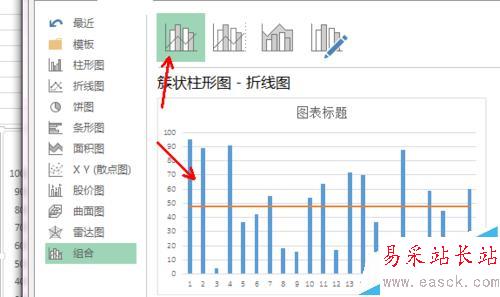 7、在彈出的對(duì)話(huà)框里面選擇第一個(gè)組合選項(xiàng),簇狀柱形圖+折線(xiàn)圖的組合形式,第二種也是一樣的,不過(guò)使用了雙坐標(biāo)軸,注意一下,效果如圖