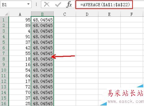 1、首先打開(kāi)excel,這里小編先隨機(jī)生成一列數(shù)據(jù),接著在旁邊的B列構(gòu)造輔助列,這一列均為A列的平均值,函數(shù)公式“=AVERAGE($A$1:$A$22)",向下拖動(dòng)產(chǎn)生數(shù)列