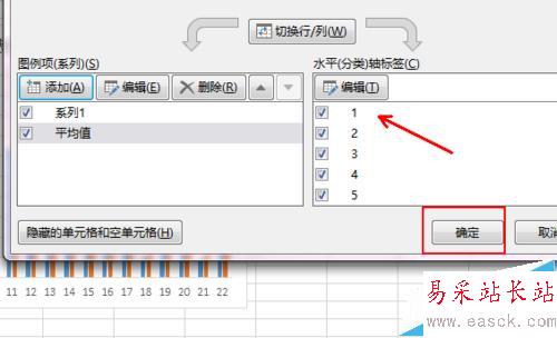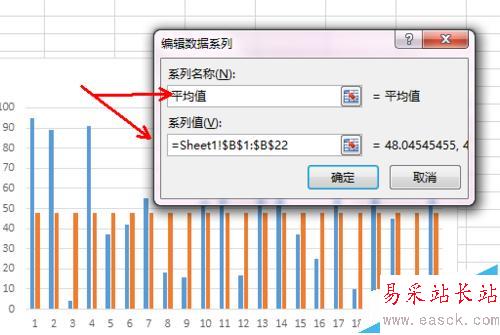 4、接著會(huì)出現(xiàn)一個(gè)編輯數(shù)據(jù)系列的對(duì)話(huà)框,在系列名稱(chēng)里面輸入平均值,在系列范圍中選擇區(qū)域B1:B22,如圖所示