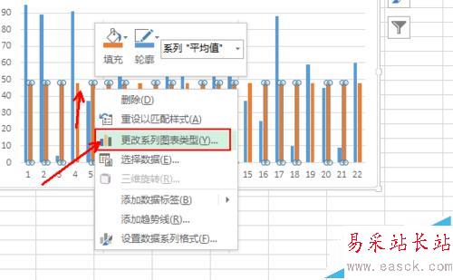 6、可以看到柱形圖里面已經(jīng)出現(xiàn)了等高的橘黃色柱形,鼠標(biāo)點(diǎn)擊選中它,右擊,點(diǎn)擊更改數(shù)據(jù)圖標(biāo)類(lèi)型,如圖所示