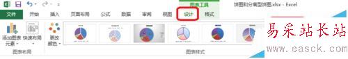4、如圖所示,美化分離型餅圖。點擊圖表工具——設計。
