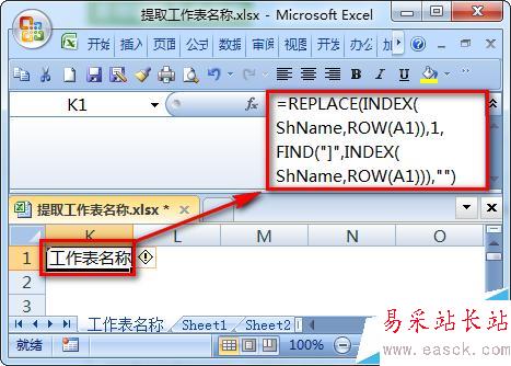 5、將公式修改一下,將中括號的部分去掉,只留下工作表名稱。公式為:=REPLACE(INDEX(ShName,ROW(A1)),1,FIND("]",INDEX(ShName,ROW(A1))),"")