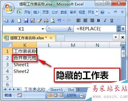 注意:工作簿中隱藏的工作表名稱也會顯示出來,本例隱藏了一個名稱為“合并單元格”的工作表。