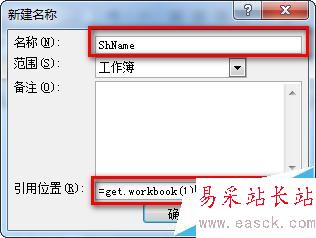 2、在【名稱】框里輸入一個定義名稱(本例輸入ShName),方便在工作表中引用。在【引用位置】處輸入=GET.WORKBOOK(1),設置完畢后點擊【確定】按鈕。