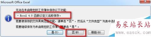 7、如果是在2007版Excel中使用宏表函數,點擊保存時會彈出下面的對話框: