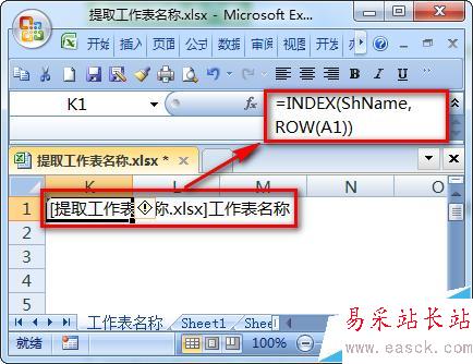 3、雙擊一個單元格,輸入公式:=INDEX(ShName,ROW(A1)),這時就返回了包括工作簿名稱的工作表名稱。