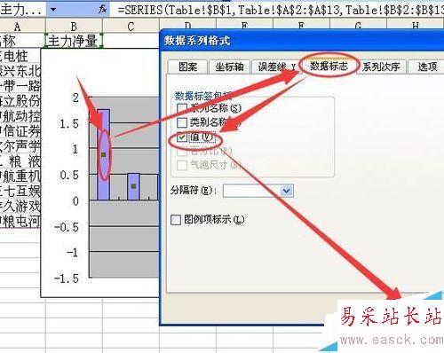 5、雙擊某個數據系列內部 然后在彈出的數據系列格式中對話框中 勾選數據標志選項卡下的值 然后點按確定