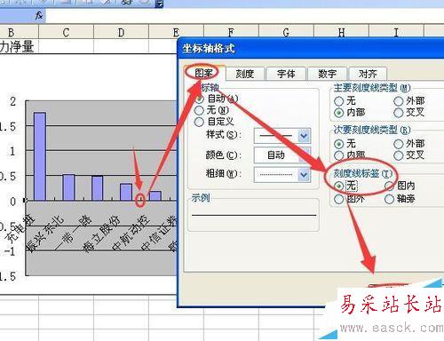 4、雙擊箭頭指向的坐標軸刻度線標簽位置 然后在彈出的坐標軸格式對話框中點按圖案選項卡 點選刻度線標簽無 然后點按確定