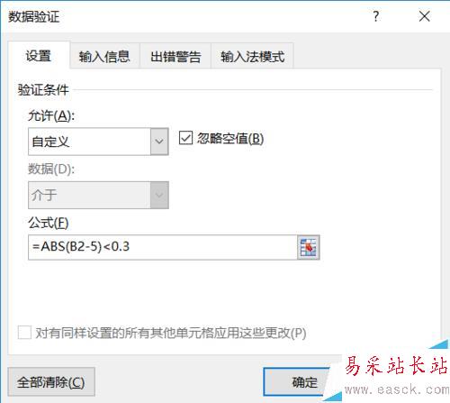 5、在設置中【條件】選擇:自定義【公式】輸入:=ABS(B2-5)<0.3,然后點擊確定