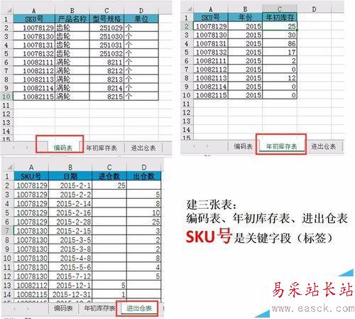 這里的SKU號是關鍵字段(標簽),有了它,就可以打通三張表的關聯。這里有2個容易犯錯的地方:①編碼表的SKU號不可重復;②進出倉表的日期用用日期格式,注意是用減號“-”連接年月日。