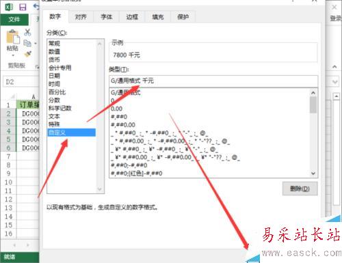 5、在打開的設置單元格格式窗口中的“數字”選項卡下,分類選擇為“自定義”,類型后面再加上【千元】二字。然后再點擊“確定”按鈕。如圖所示;