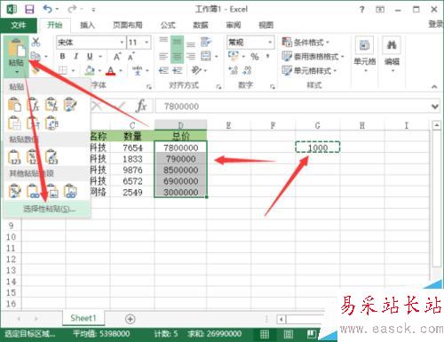 2、在打開的Excel工作表中,首先復制G2單元格的數據,再按住鍵盤的Ctrl+C鍵進行復制,選中D2:D6單元格區域,點擊“粘貼”-->“選擇性粘貼”選項。如圖所示;