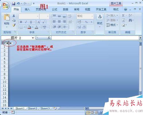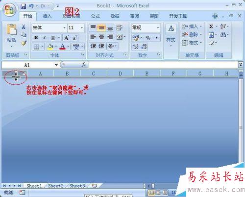 1、如圖2的畫面,首先鼠標光標移動到列標和行號左上角的全選按鈕附近,接近全選按鈕與行號交接處邊緣,當鼠標指針變成上下箭頭推開的標志時,右擊鼠標,選擇“取消隱藏”即可恢復所有隱藏的列。