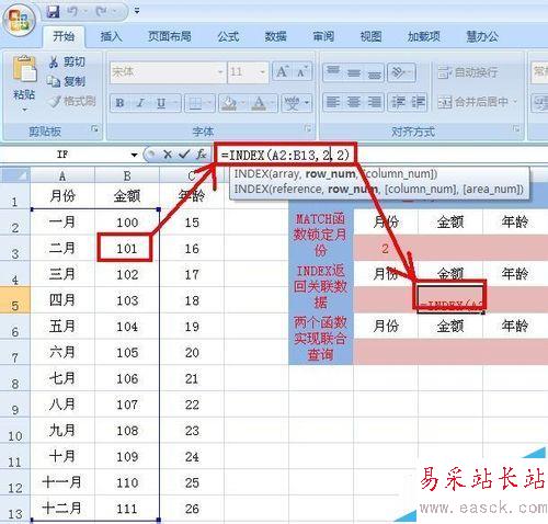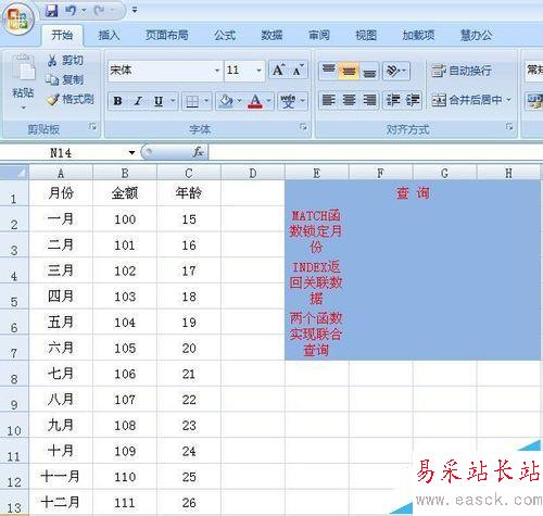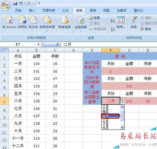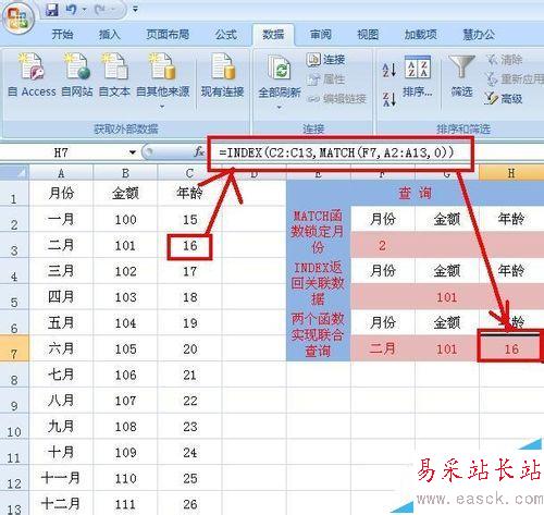 2、用同樣的方法再H7單元格中輸入:=INDEX(C2:C13,MATCH(F7,A2:A13,0)),即可查詢出月份對應的年齡。