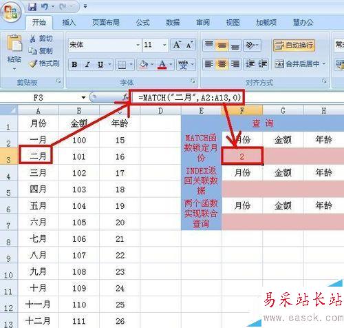 2、選擇F3單元格,在單元格中輸入:=MATCH("二月",A2:A13,0),回車可以看到二月所對應的行數為2.