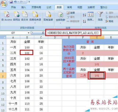1、選擇G7單元格,在單元格中輸入:=INDEX(B2:B13,MATCH(F7,A2:A13,0)),用MATCH函數返回F7單元格中的之所對應的行,再利用ATCH函數返回的行號用INDEX函數查詢出月份對應的金額。